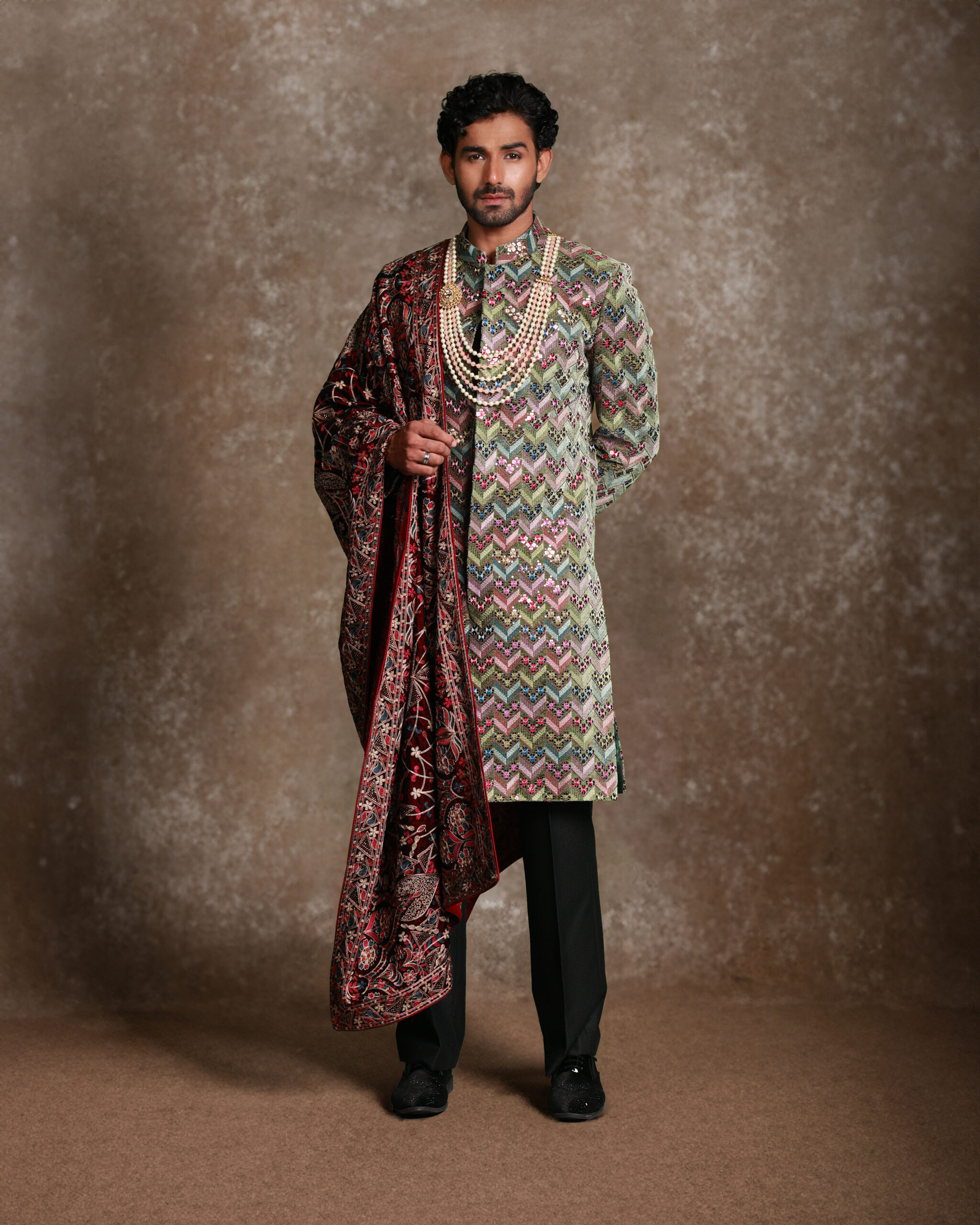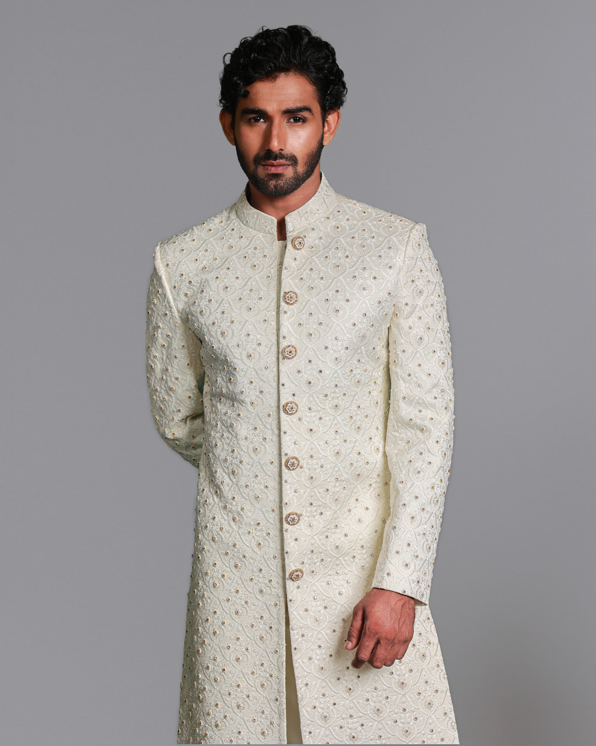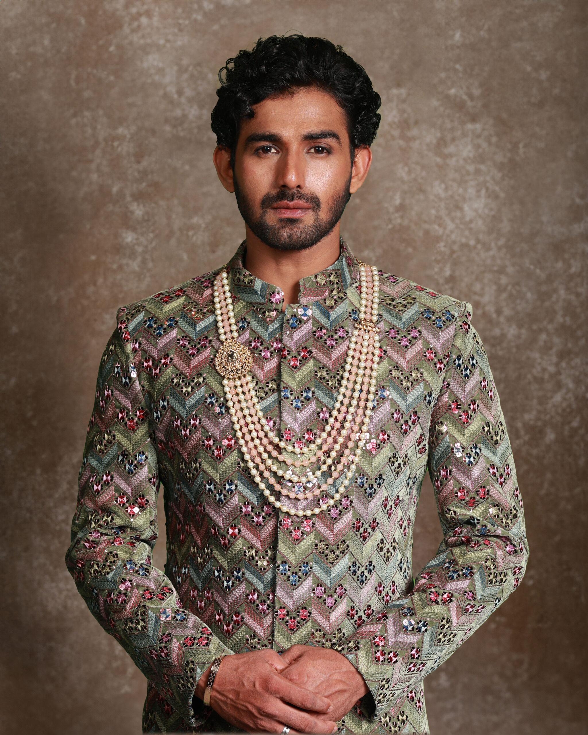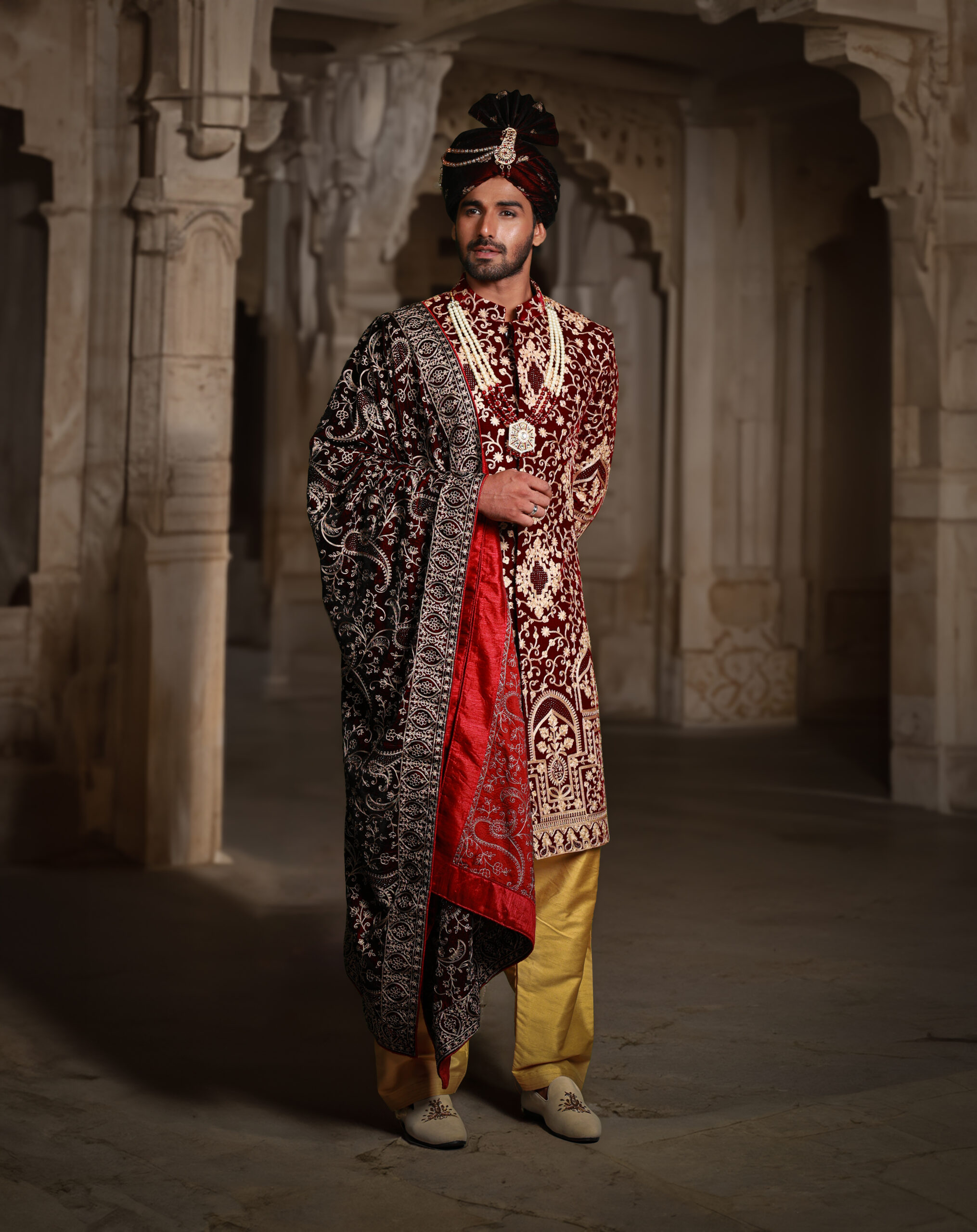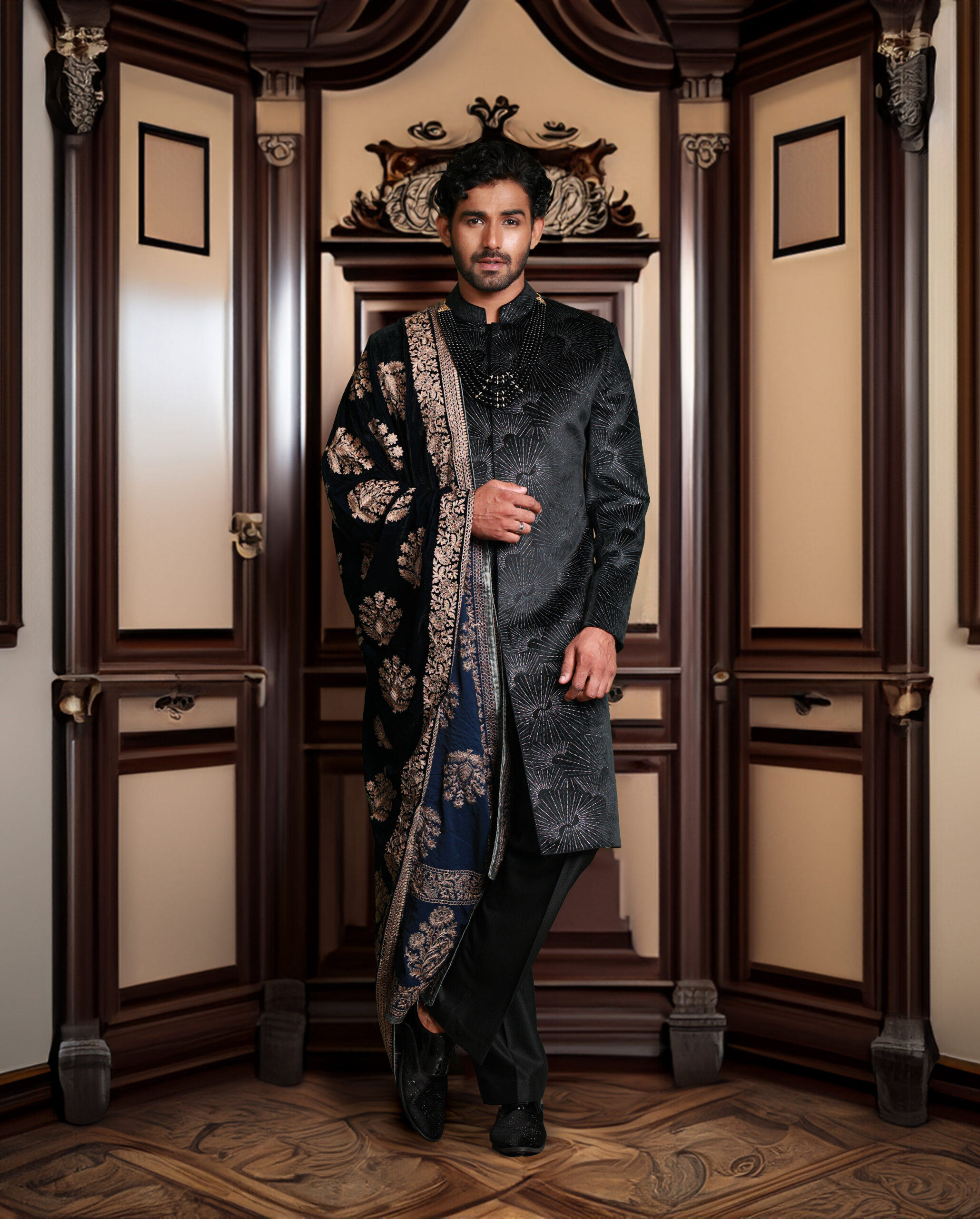 The Sherwani collection from House of Messcal reflects the perfect fusion of royal tradition and modern elegance. Each Sherwani is crafted with exquisite attention to detail, featuring luxurious fabrics, intricate embroidery, and sophisticated cuts that embody timeless grandeur. Designed for the discerning groom, our Sherwanis celebrate India's rich cultural heritage while adding a contemporary flair that enhances every special occasion. At House of Messcal, we ensure every piece not only defines style but also tells a story of grace, confidence, and regal charm.