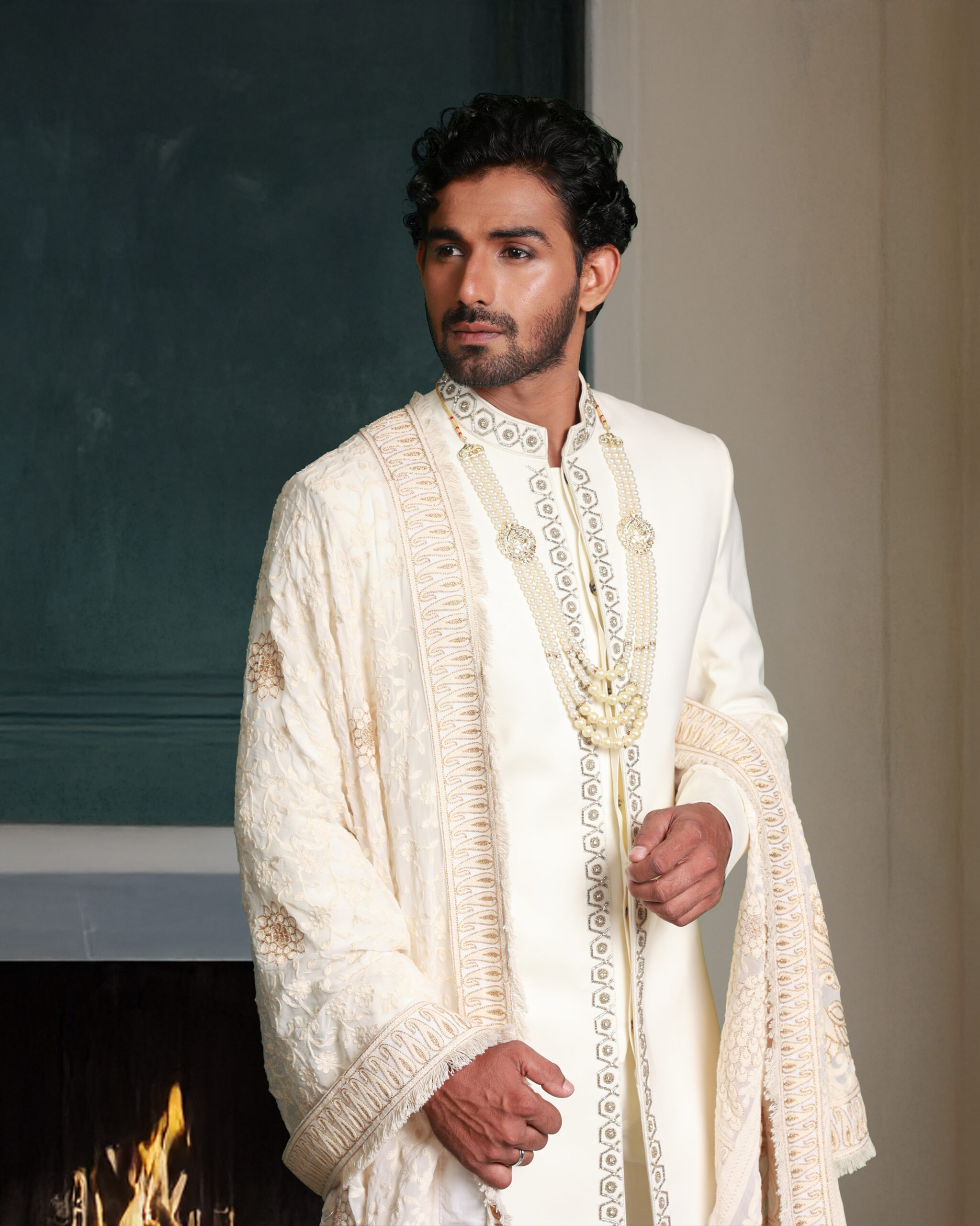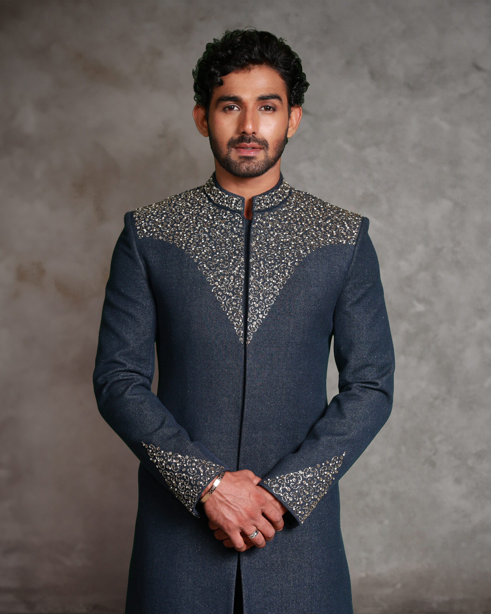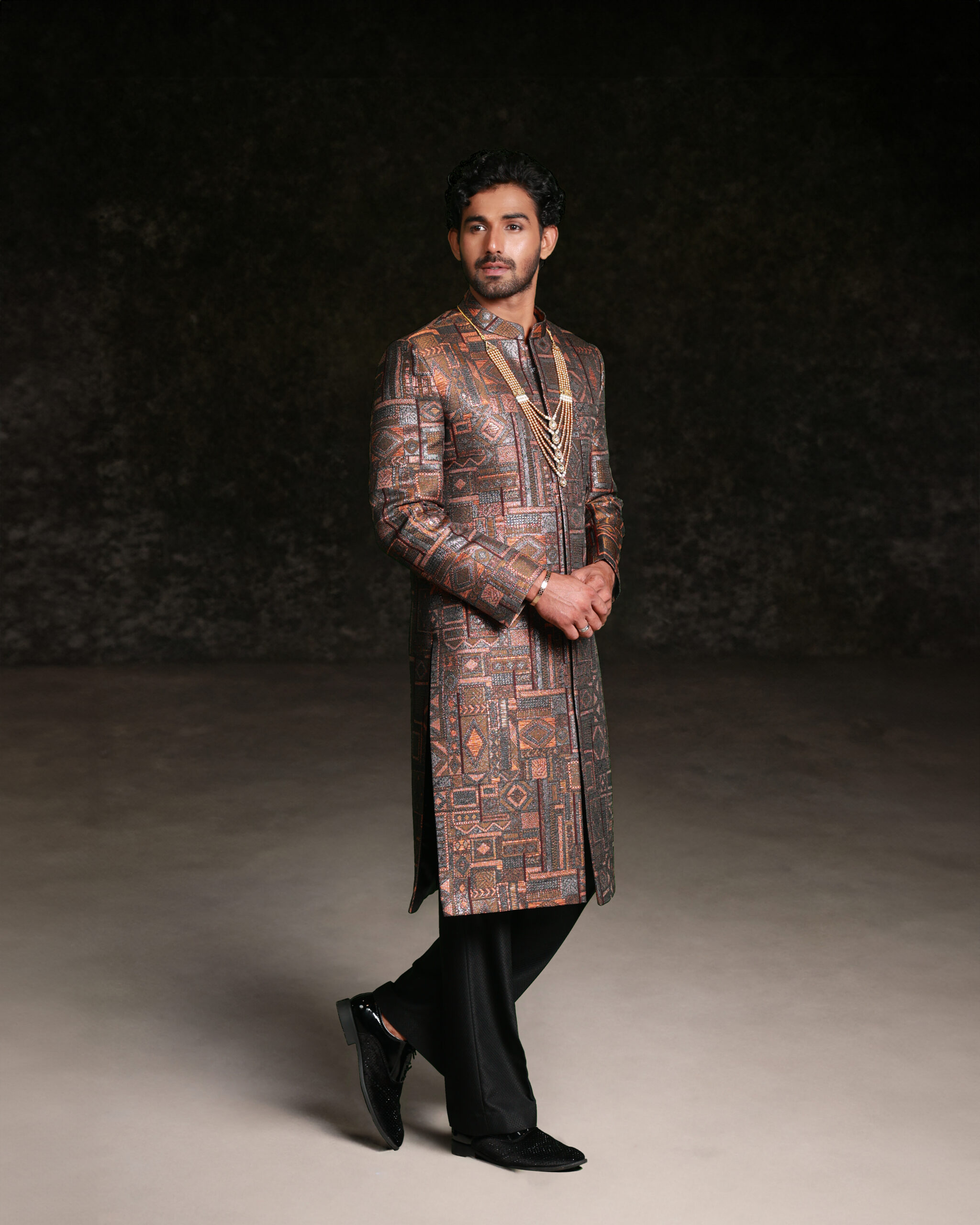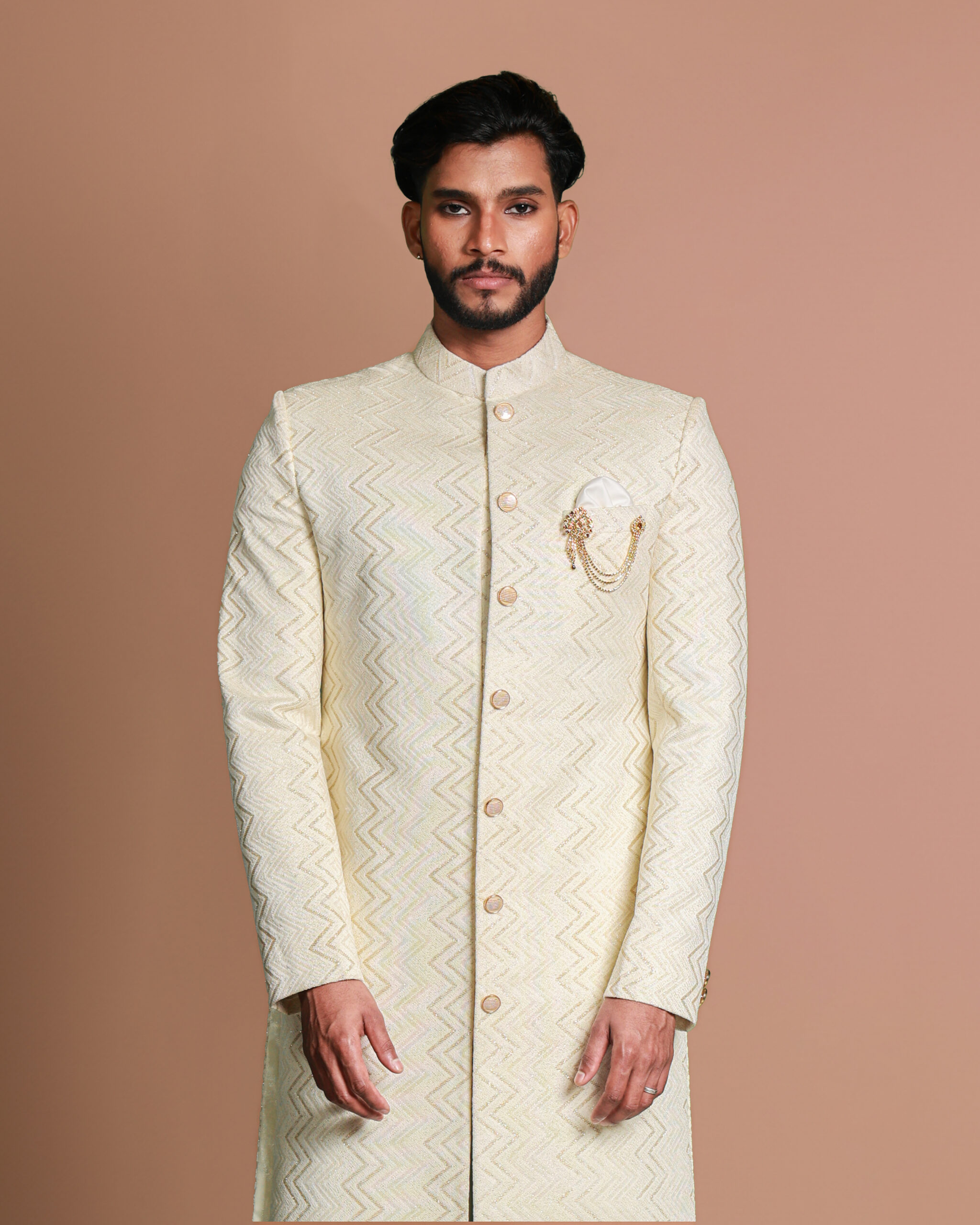 The Sherwani collection from House of Messcal reflects the perfect fusion of royal tradition and modern elegance. Each Sherwani is crafted with exquisite attention to detail, featuring luxurious fabrics, intricate embroidery, and sophisticated cuts that embody timeless grandeur. Designed for the discerning groom, our Sherwanis celebrate India's rich cultural heritage while adding a contemporary flair that enhances every special occasion. At House of Messcal, we ensure every piece not only defines style but also tells a story of grace, confidence, and regal charm.