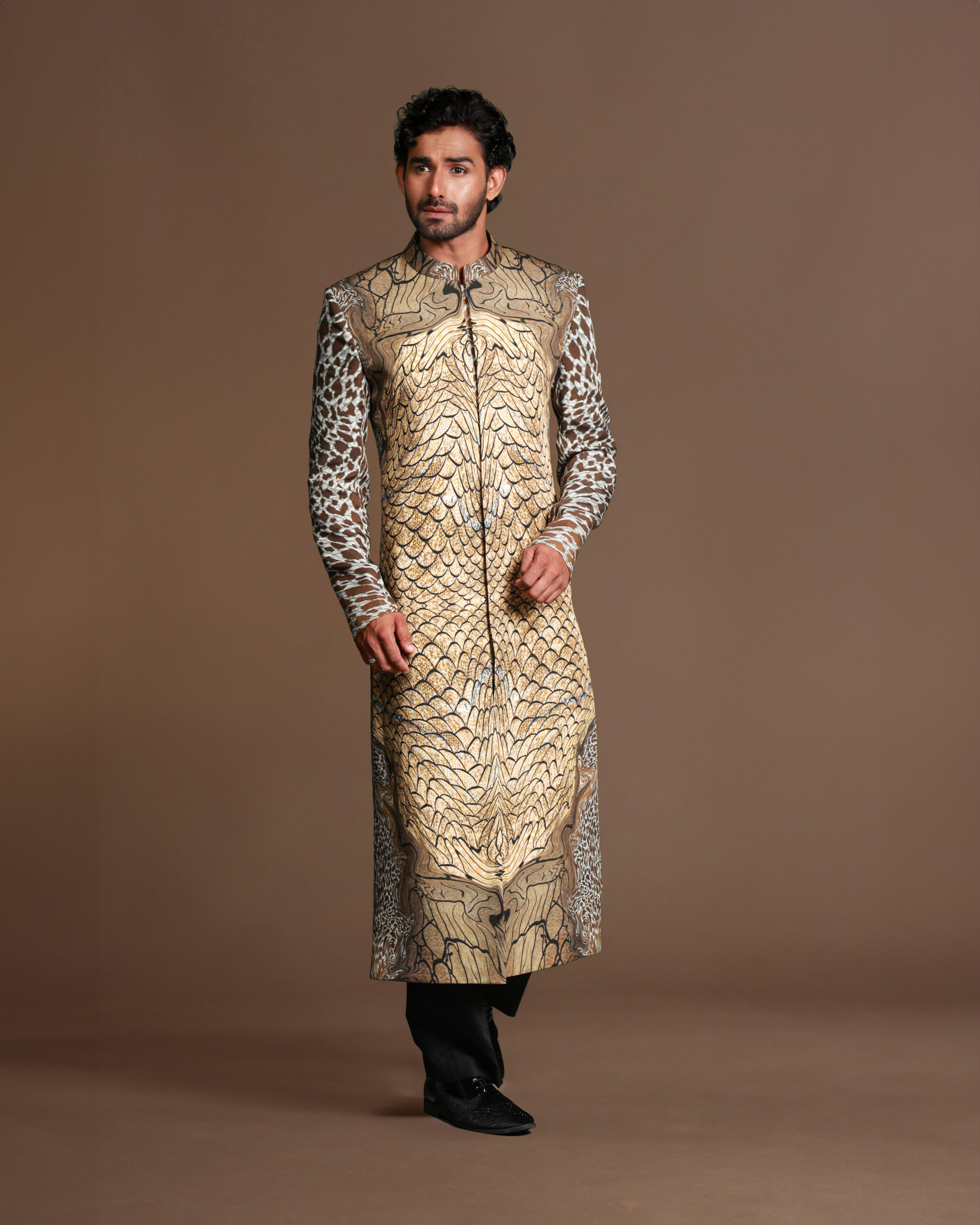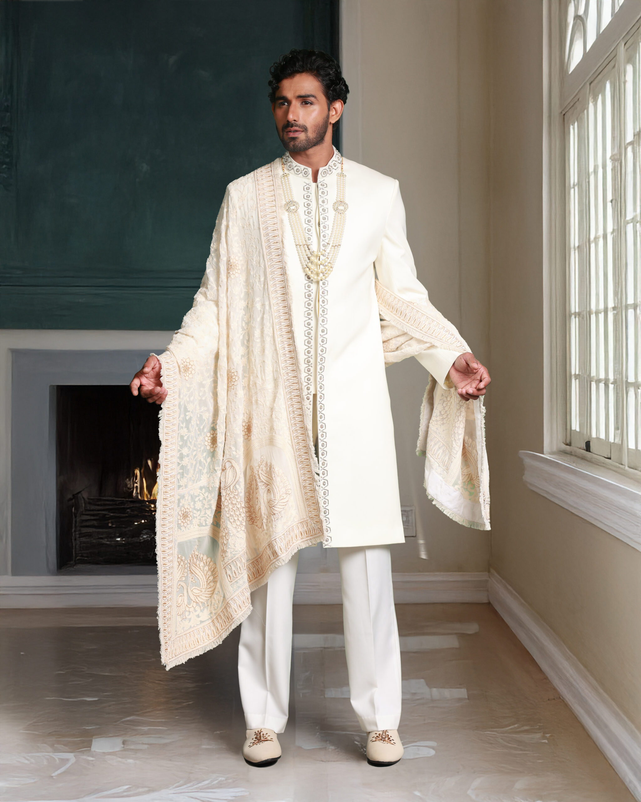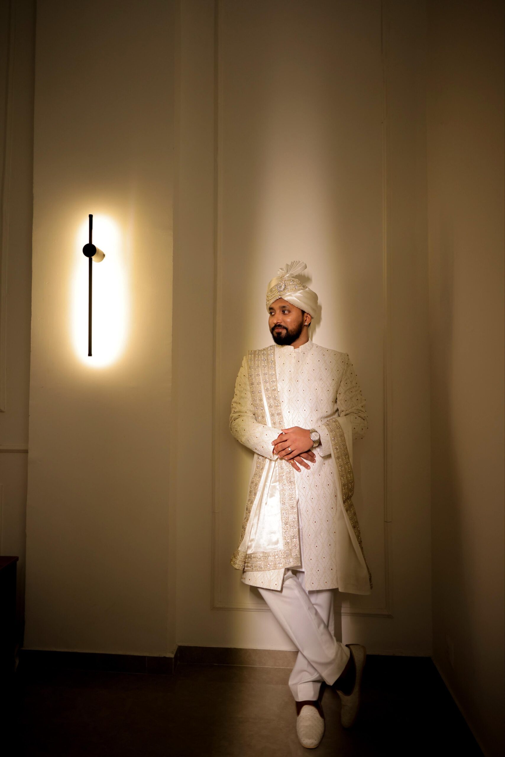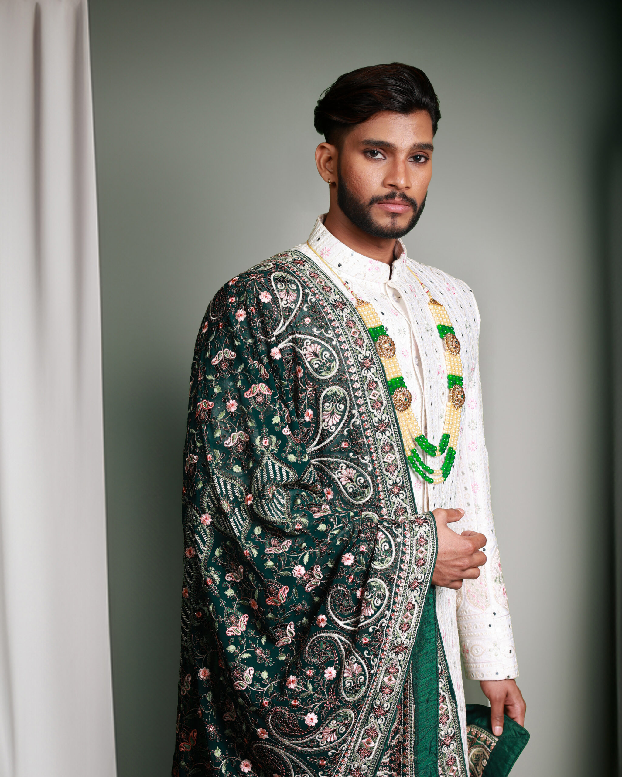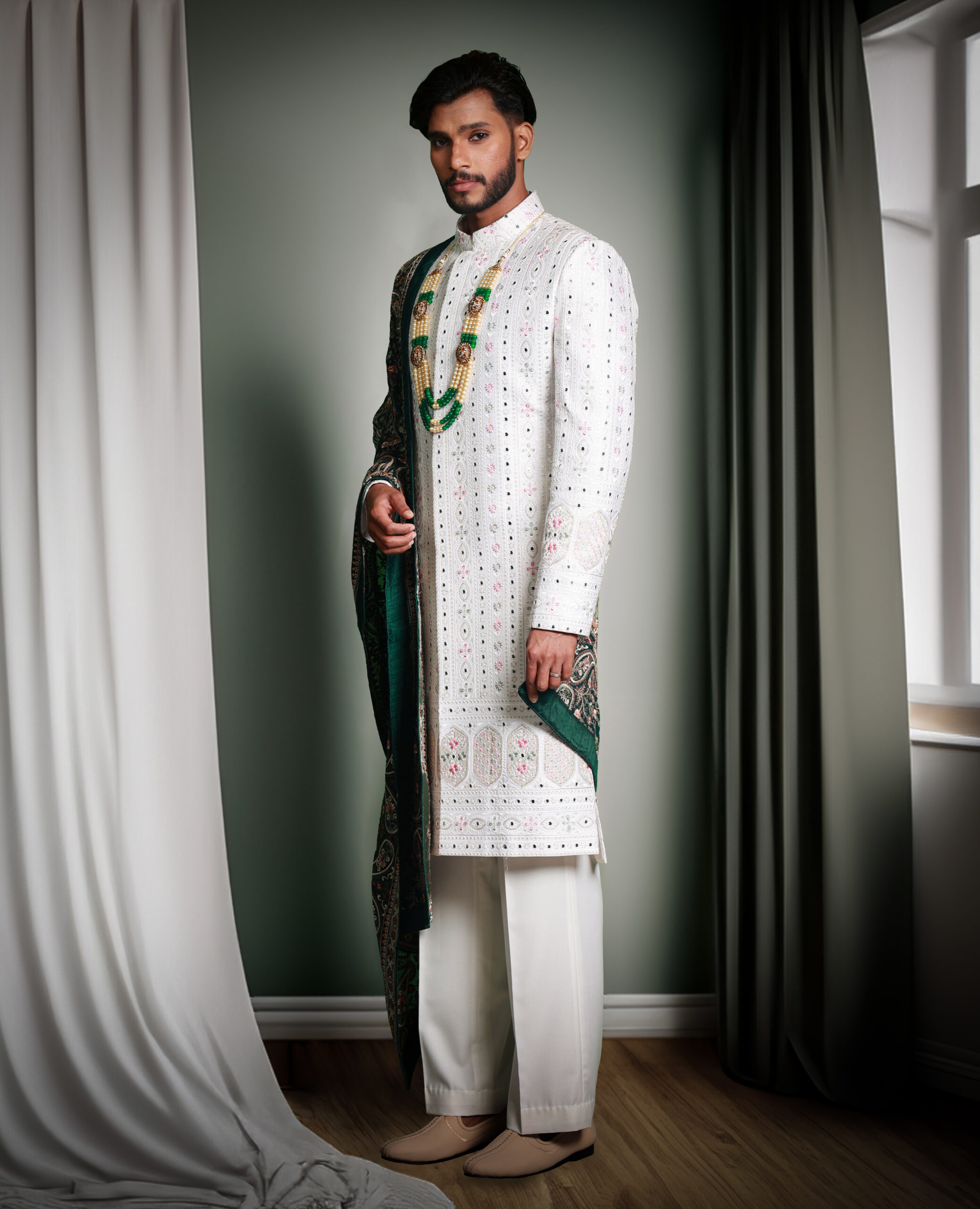 The Sherwani collection from House of Messcal reflects the perfect fusion of royal tradition and modern elegance. Each Sherwani is crafted with exquisite attention to detail, featuring luxurious fabrics, intricate embroidery, and sophisticated cuts that embody timeless grandeur. Designed for the discerning groom, our Sherwanis celebrate India's rich cultural heritage while adding a contemporary flair that enhances every special occasion. At House of Messcal, we ensure every piece not only defines style but also tells a story of grace, confidence, and regal charm.