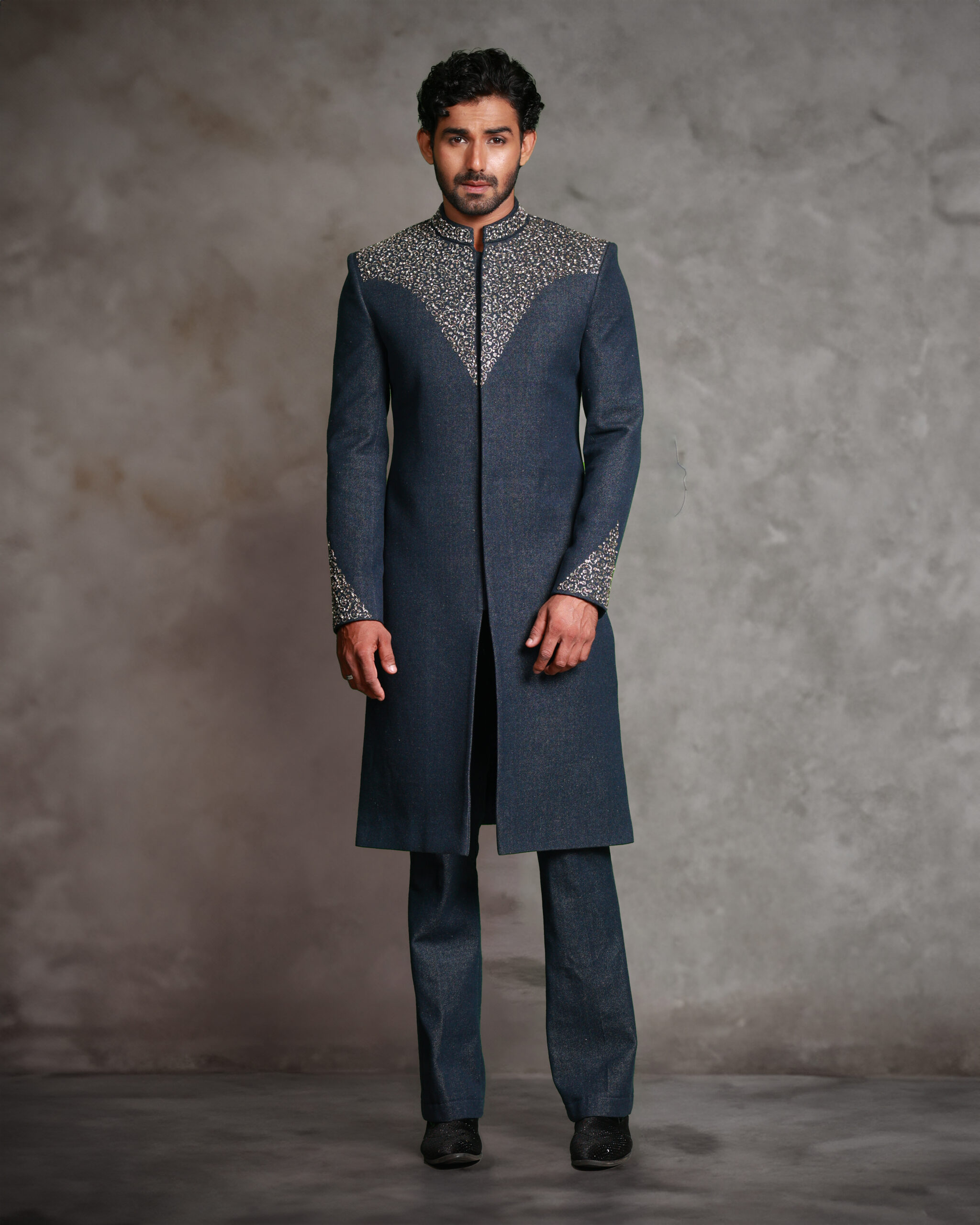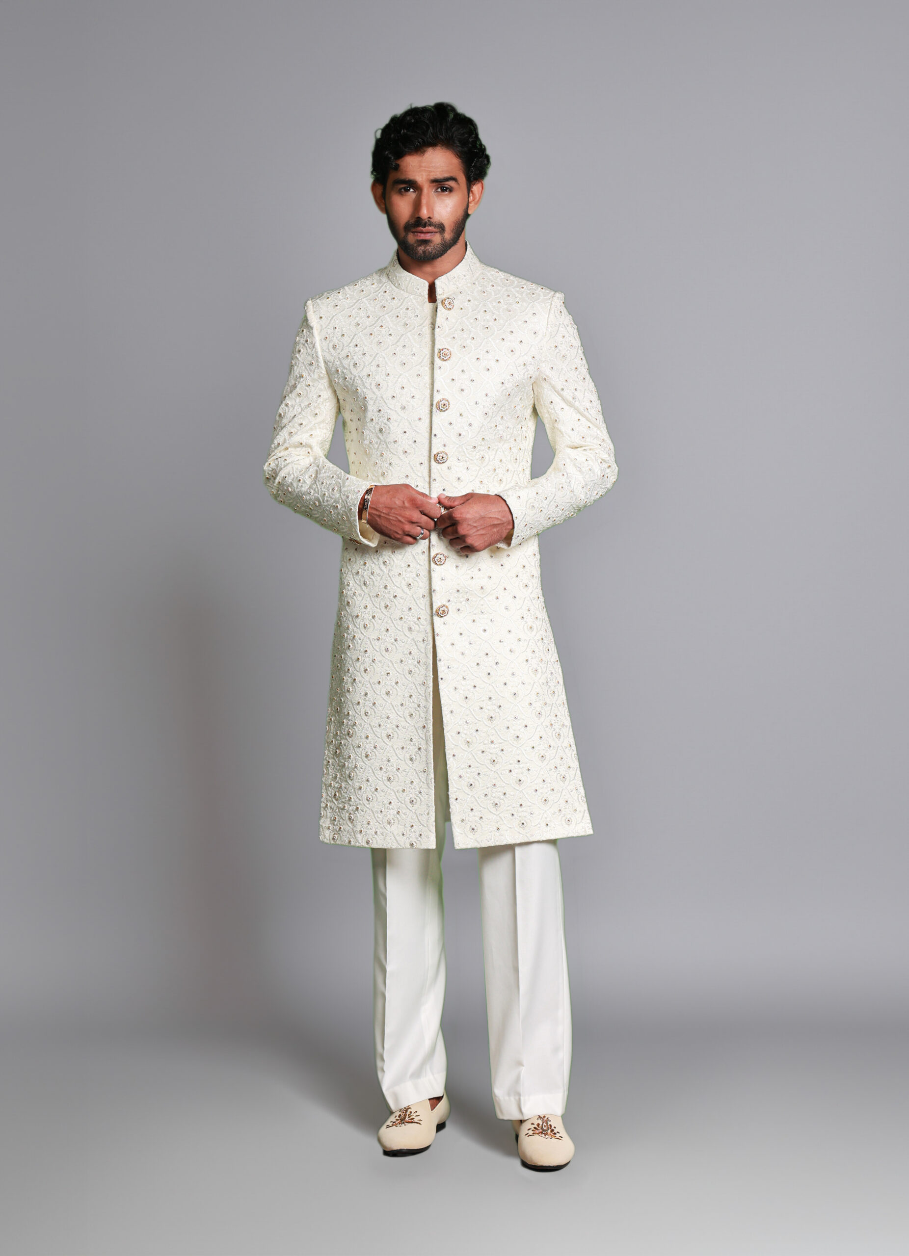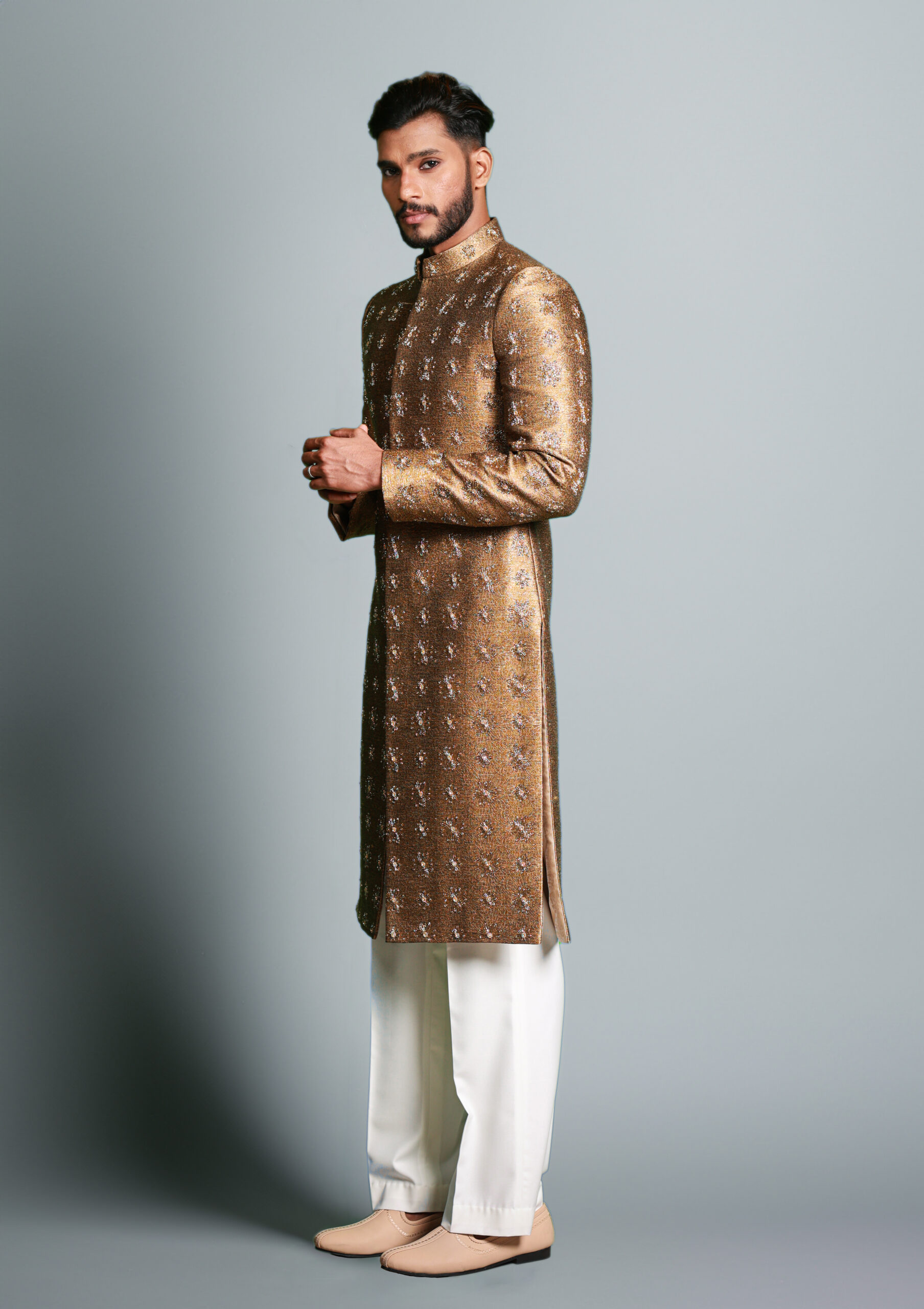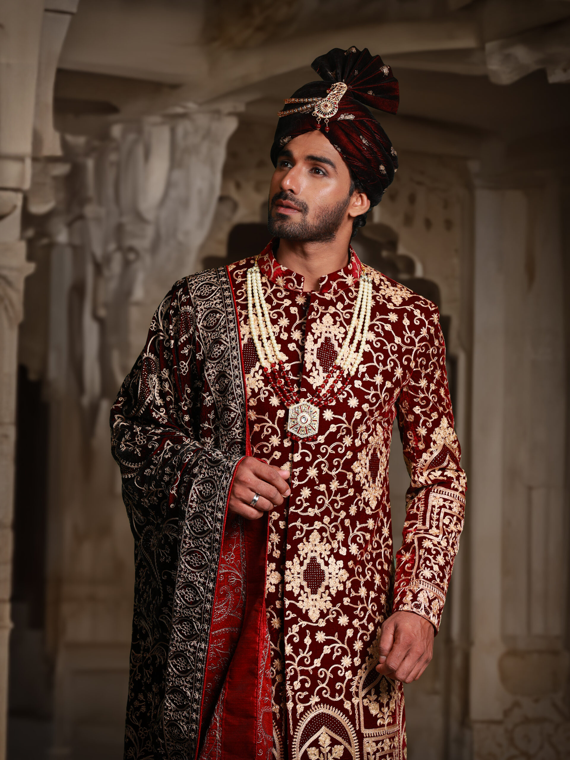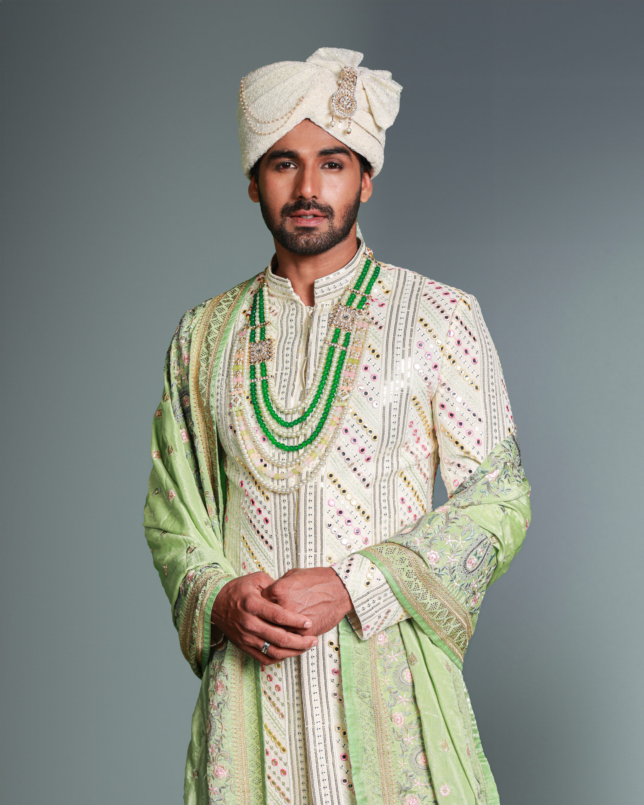 The Sherwani collection from House of Messcal reflects the perfect fusion of royal tradition and modern elegance. Each Sherwani is crafted with exquisite attention to detail, featuring luxurious fabrics, intricate embroidery, and sophisticated cuts that embody timeless grandeur. Designed for the discerning groom, our Sherwanis celebrate India's rich cultural heritage while adding a contemporary flair that enhances every special occasion. At House of Messcal, we ensure every piece not only defines style but also tells a story of grace, confidence, and regal charm.
